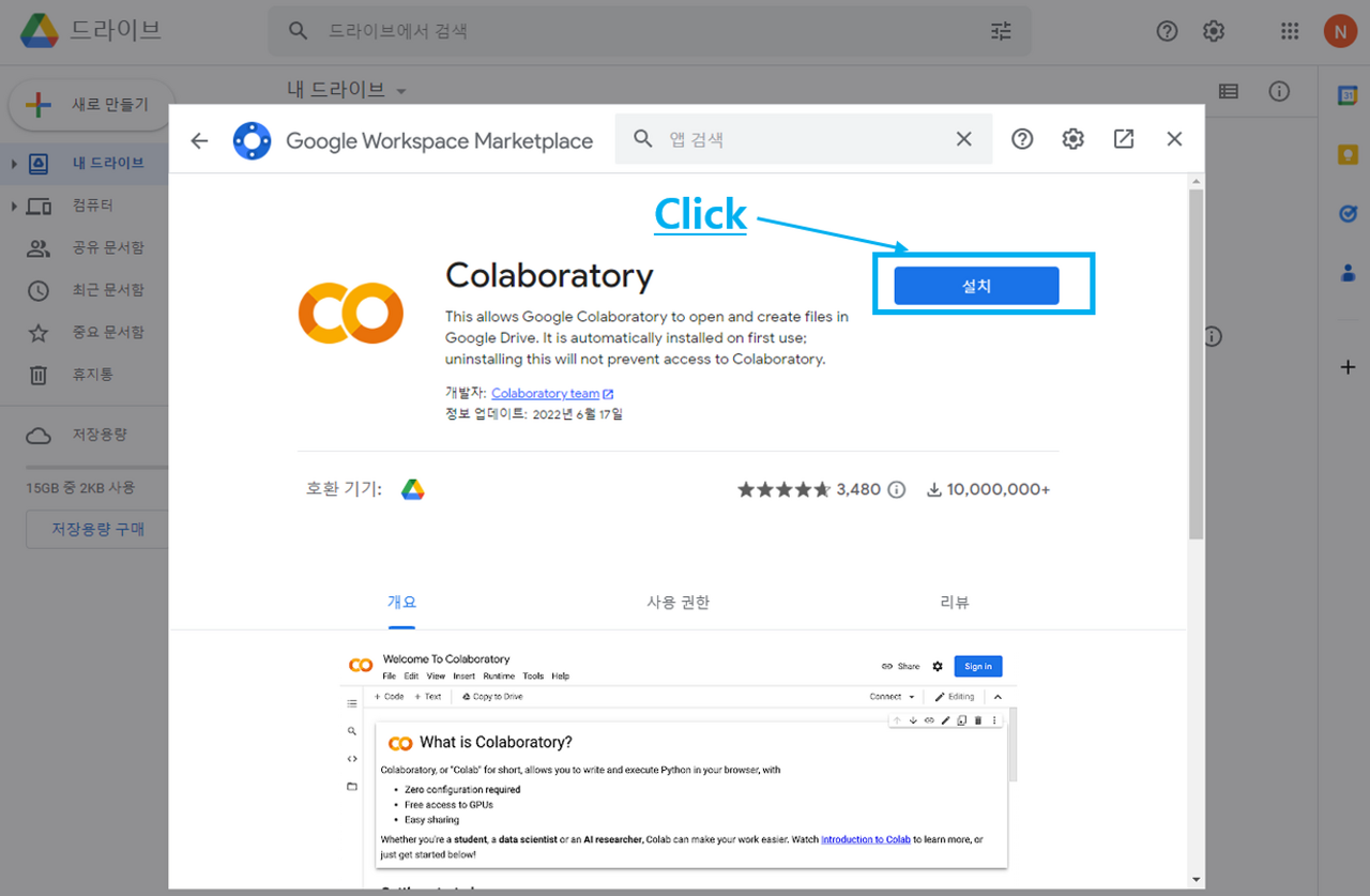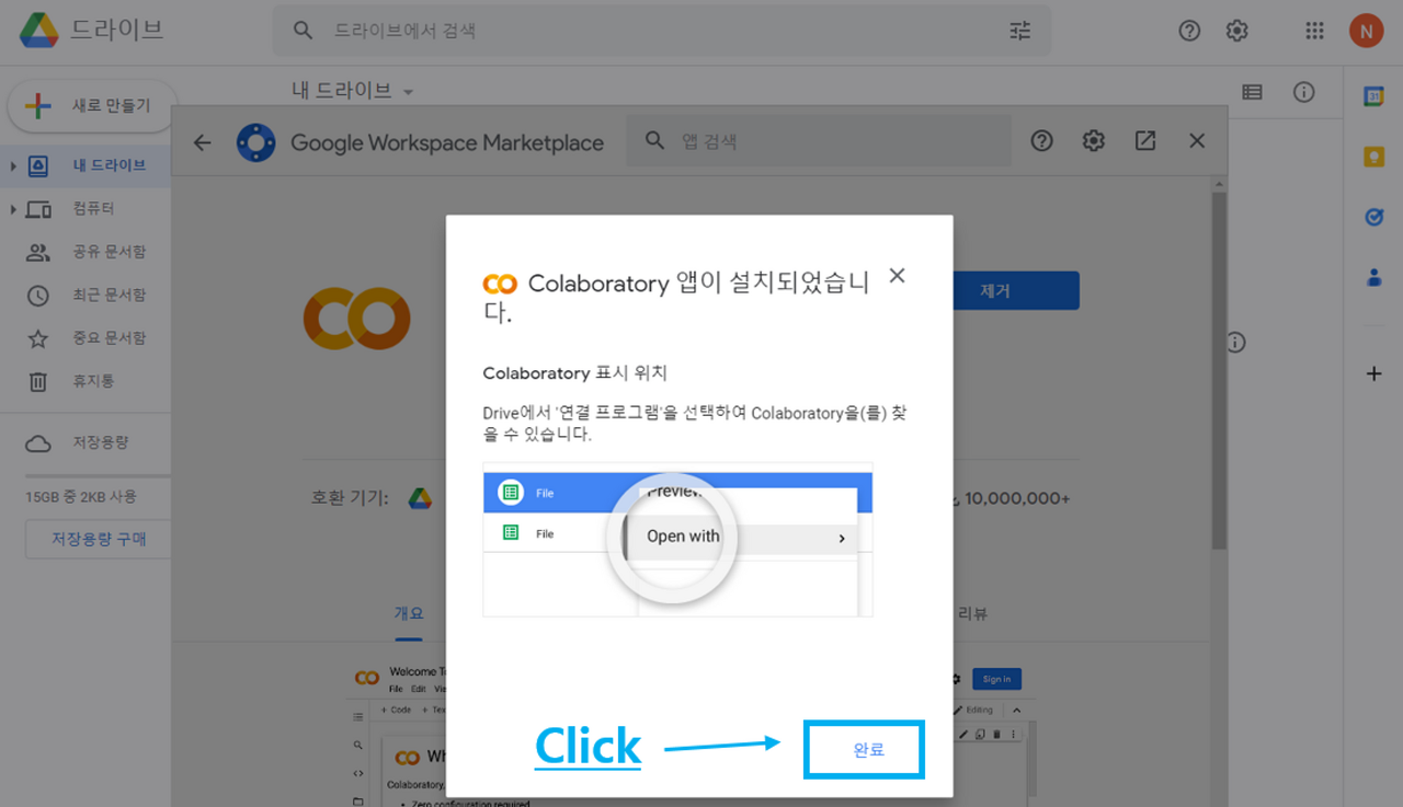 - “Google Colaboratory”가 설치되지 않았을 경우, “연결할 앱 더보기”를 클릭하여 “Colaboratory”를 검색후 설치