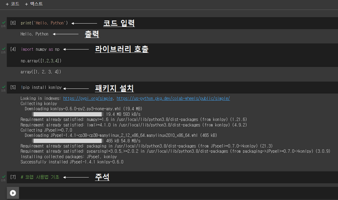 - !pip install 패키지 이름을 입력하고 실행하면 코랩에서 패키지를 실행할 수 있습니다.