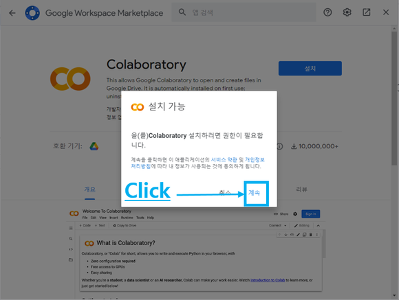 - 새노트를 클릭하면 자동으로 “Colaboratory” App 자동 설치됨.
