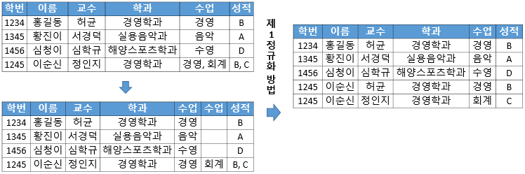 - 갱신 이상 : 1234번 홍길동 학생이 교수를 변경할 때, 허균인 행을 모두 찾아서 변경해주어야 한다.